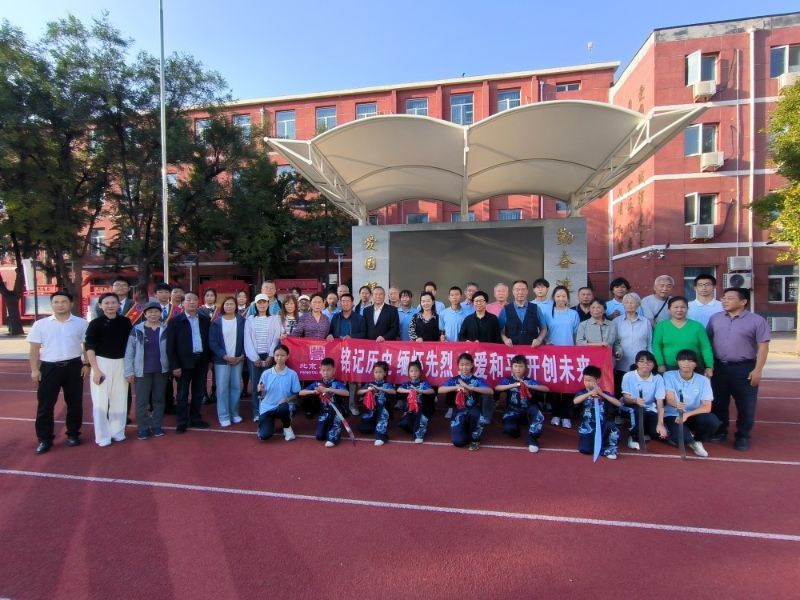 當天下午參訪團前往南苑兵營,這里曾見證過無數抗戰將士的熱血與忠誠,大家在兵營中駐足凝望,追憶先輩們的英勇過往。之后大家又走進北京市佟麟閣學校,共同觀看孩子們表演的大刀操,一招一式盡顯力量與朝氣,讓大家看到了抗戰精神和愛國擔當的傳承。大家向佟麟閣雕像獻上鮮花,表達對先烈的緬懷與敬仰之情。 在學校的佟麟閣展廳,大家認真聆聽講解,進一步了解佟麟閣將軍的英勇事跡,向學校捐贈了“二十九軍軍訓團團史”手書,并就展館補充完善提出了建議。