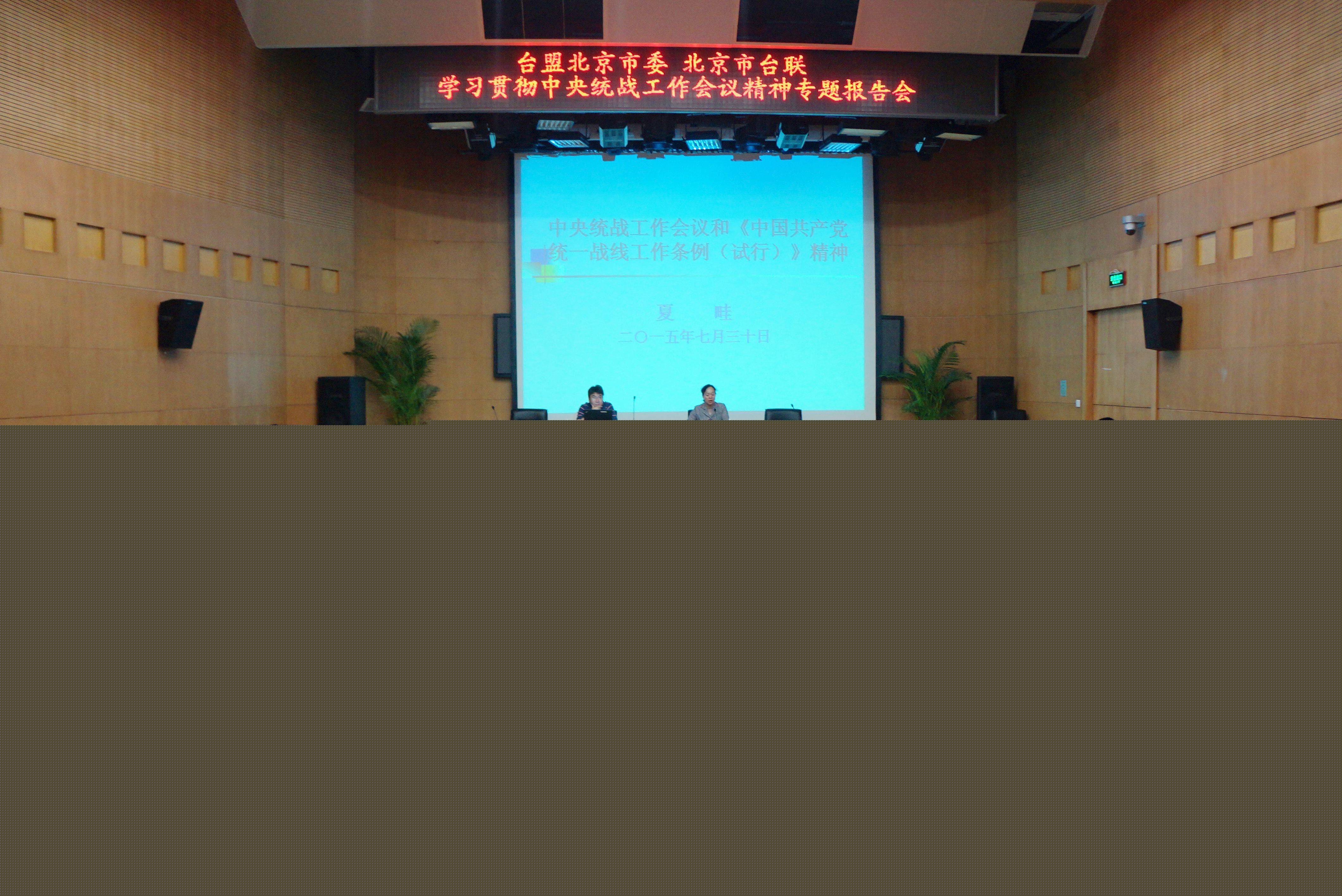 ??? 北京市臺辦政務網消息? 7月30日上午,臺盟北京市委、北京市臺聯聯合舉辦學習貫徹中央統戰工作會議精神專題報告會。出席報告會的領導有臺盟北京市委副主委汪舟、秘書長彭京玉,市臺聯副會長鄭大、秘書長張曉軍,在京臺盟盟員、臺胞以及機關干部共80人參加報告會。
