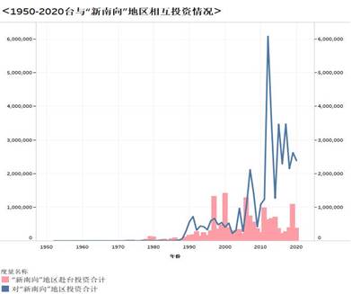 臺灣地區與所謂“新南向”地區的投資關系大致可追溯至上世紀50年代。據臺經濟統計部門統計,1953年臺吸引“新南向”地區總投資86萬美元,2019年增長至11億美元,70年間累計吸引投資約162億美元。臺商對“新南向”地區的投資則始于1959年,當年投資約10萬美元,2019年增長至26.2億美元,?70年間累計吸引投資約404億美元。2020年臺對“新南向”地區投資總金額23.8億美元;吸引該地區投資金額約3.8億美元。