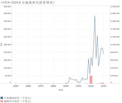 注:為使越南對臺投資柱形圖有所顯示,采用不同上限的坐標軸。