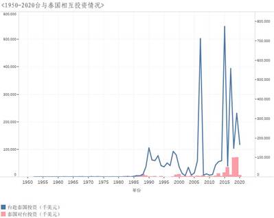 臺與泰國相互投資大致始于上世紀50年代。據臺經濟統計部門統計,1953年泰國對臺投資37萬美元,2019年增長至7000萬美元,2020年約589萬美元,占臺吸引外資總額的0.06%。臺商赴泰國投資大約始于60年代,1962年臺商赴泰國投資約49萬美元,2019年增長至3.3億美元,2020年約1.7億美元,?約占臺對外投資(大陸地區除外)總額的1.41%。