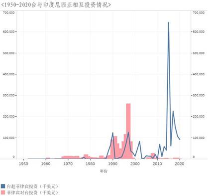投資是考察臺當局“新南向政策”實施成效的重要指標之一。上世紀90年代李登輝推動“南向政策”后,在投資帶動下臺灣地區與東南亞地區貿易及其它經濟聯系日益緊密,當時與臺經貿關系發展最迅速的是新加坡、馬來西亞、菲律賓等地。但隨后受東南亞金融危機以及臺商加快赴大陸投資等因素影響,臺與東南亞各地經貿往來又趨于回落。2016年以來,蔡英文當局提出并大力推動“新南向政策”,越南、新加坡、印度尼西亞等地逐漸成為臺商投資重點,但臺與多數“新南向”地區的資金往來增長態勢并不明顯。以下整理臺經濟統計部門公布的吸引外資及對外投資數據(1950-2020年),將臺對“新南向”18地(有統計的僅9個地區)幾十年來的相互投資數據制成可視化圖表,為評估臺“新南向政策”提供一種直接的觀察視角。