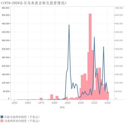 臺與馬來西亞相互投資大致始于上世紀60年代,此前被記錄在案的僅零星小額投資。據臺經濟統計部門統計,1963年馬來西亞對臺投資120萬美元,2019年增長至4700萬美元,2020年約4644萬美元,占臺吸引外資總額的0.51%。1964年臺商赴馬來西亞投資約16萬美元,2019年增長至1.0億美元,2020年約4079萬美元,?約占臺對外投資(大陸地區除外)總額的0.35%。