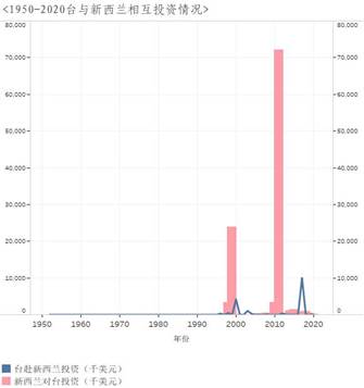 臺與新西蘭相互投資大致始于上世紀90年代,且主要是新西蘭對臺投資。據臺經濟統計部門統計,1992年新西蘭對臺投資20萬美元,2019年增長至56萬美元,2020年約16萬美元,占臺吸引外資總額比重不到0.01%。臺商對新西蘭投資較少,2020年沒有投資,截至目前累計投資僅1662萬美元,約占臺對外投資(大陸地區除外)總額的0.01%。