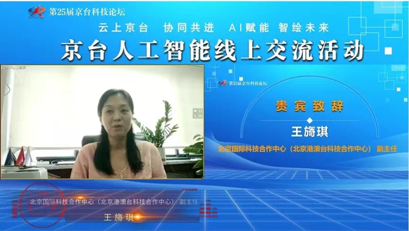 北京國際科技合作中心(北京港澳臺科技合作中心)副主任王旖琪致辭。王主任代表主辦方對參會的各位專家、各位代表表示衷心的感謝,并介紹了北京國際科技合作中心的基本情況。王主任講到,隨著《關于深化京臺經濟文化交流合作的若干措施》等重要政策的發布,進一步深化了兩岸的交流與合作,為京臺的科技合作搭建起了更為便捷、務實、高效的交流平臺,通過該平臺能夠有序地推動京臺的科技合作、人文交流,進一步促進兩岸的科技資源互聯互通,為臺資企業在京投資和開展經濟科技合作開辟了新的道路,也實現了以科技創新引領兩岸經濟融合以及高質量發展。王主任還介紹了本次活動的形式、內容和意義,并表示,活動將通過優勢項目的云上路演,聚集京臺兩地AI領域高端專家進行主旨演講、產業界企業家進行經驗交流和案例分享,圍繞京臺AI發展現狀、技術壁壘和應用前景共同研討、共商對策、共謀合作,充分發揮京臺兩地的特有優勢,促進新形勢下京臺科技合作交流,構建創新合作生態圈,全面推動兩岸科技創新建設和發展。