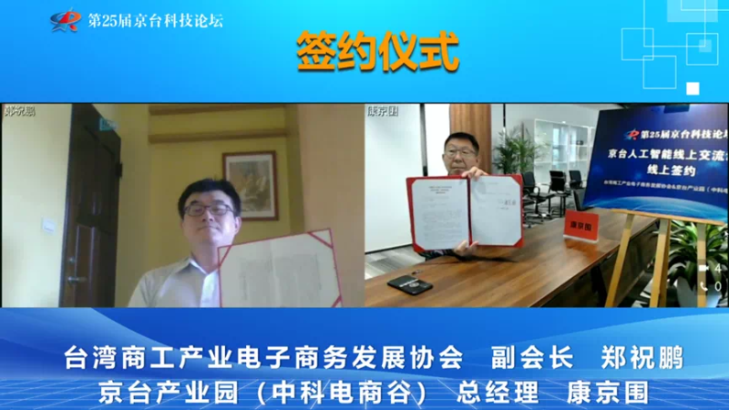 臺灣商工產業電子商務發展協會副會長鄭祝鵬、京臺產業園(中科電商谷)總經理康京圍代表雙方單位通過視頻連線的方式簽署戰略合作協議。雙方單位將進一步加強資源共享和深度合作,為兩岸企業搭建科技經濟交流平臺,促進人工智能產業高質量融合發展。